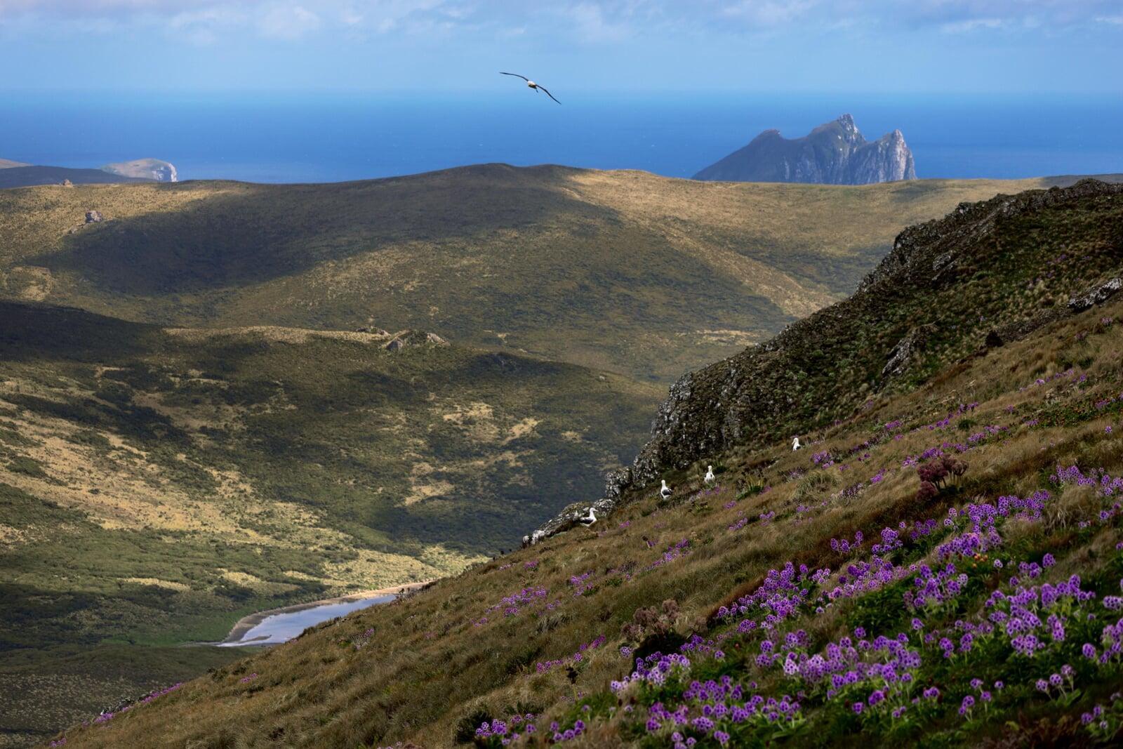 Southern Royal Albatross were nesting almost immediately once we cleared the lower tussock, and further up, groups of four or five birds were engaged in courtship, calling and spreading their wings, lifting into the wind above the ridge. They climbed to considerable height, then swept back down in slow arcs over the sea. I stayed approximately 100 to 150 metres below the summit, choosing to spend the time working compositions - landscape framings with the bay visible below, closer portraits of nesting birds, and the courtship groups in flight - rather than continuing to the top.
